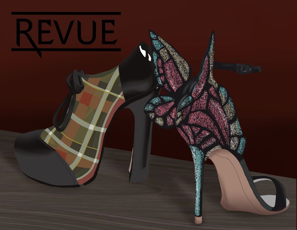 An illustration for the fictional magazine Revue. It features shoes from designers Vivienne Westwood (left) and Sophia Webster (right).